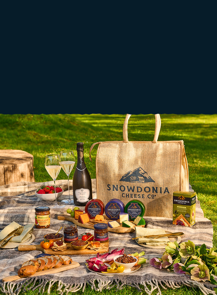 For outdoor feasting in style. Open this smart Snowdonia Cheese Co jute cool bag to find an assortment of three of our bestselling cheeses – Green Thunder, Red Storm and Rock Star – and a pair of sweet and tangy chutneys. We’ve also included a chunky tapenade with olives, sun-dried tomatoes, feta and Greek basil, plus some crunchy Wholemeal & Extra Virgin Olive Oil Crackers. Time to unfurl the picnic blanket…