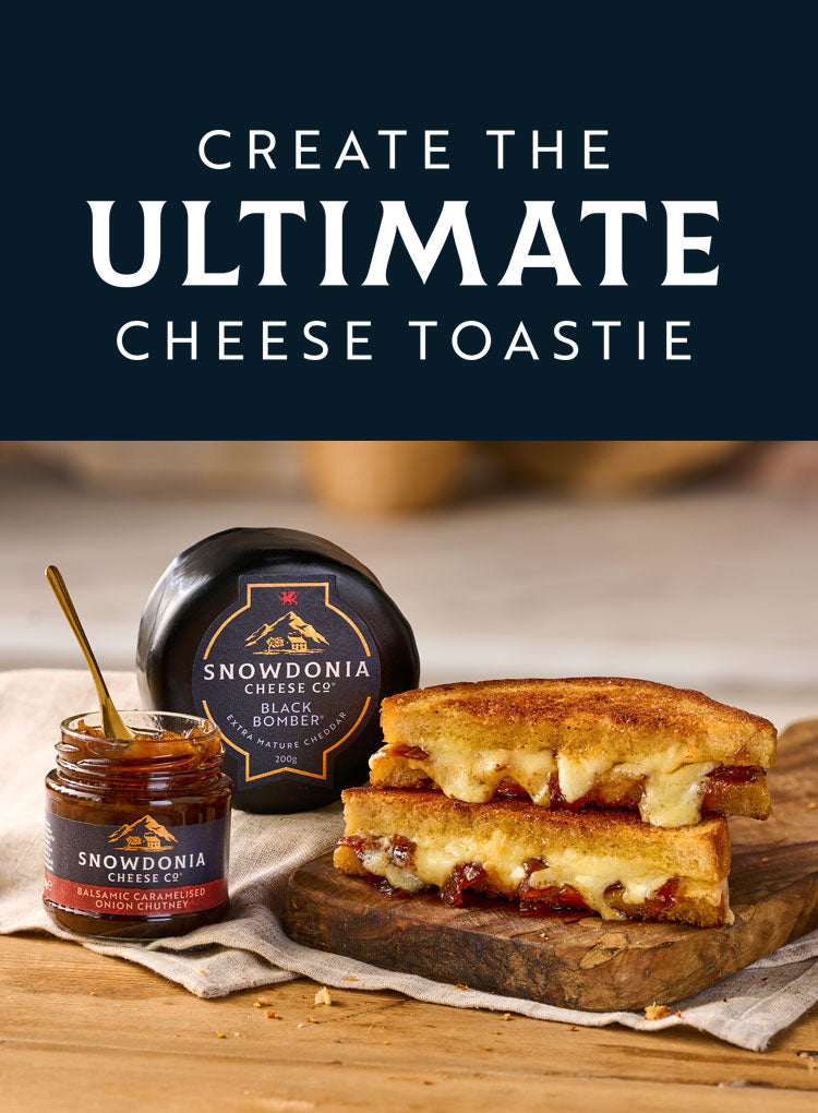 Introducing the Ultimate Cheese Toastie, bringing together the intensely savoury notes of our award-winning Black Bomber extra mature Cheddar and our irresistibly sweet and tangy Balsamic Caramelised Onion Chutney. Rich and creamy Cheddar. Sweet caramelised onions with aged balsamic vinegar. It’s a deliciously indulgent pairing, melted within golden slices of buttered sourdough bread. Savour every bite.
